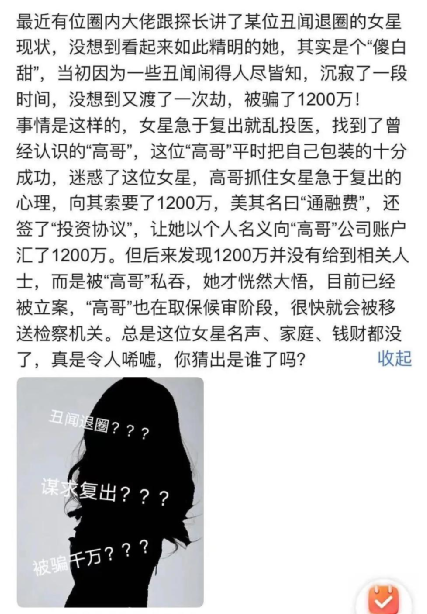 近日,有人爆料某女星因出轨退圈,为了复出,被人骗走了1200万。