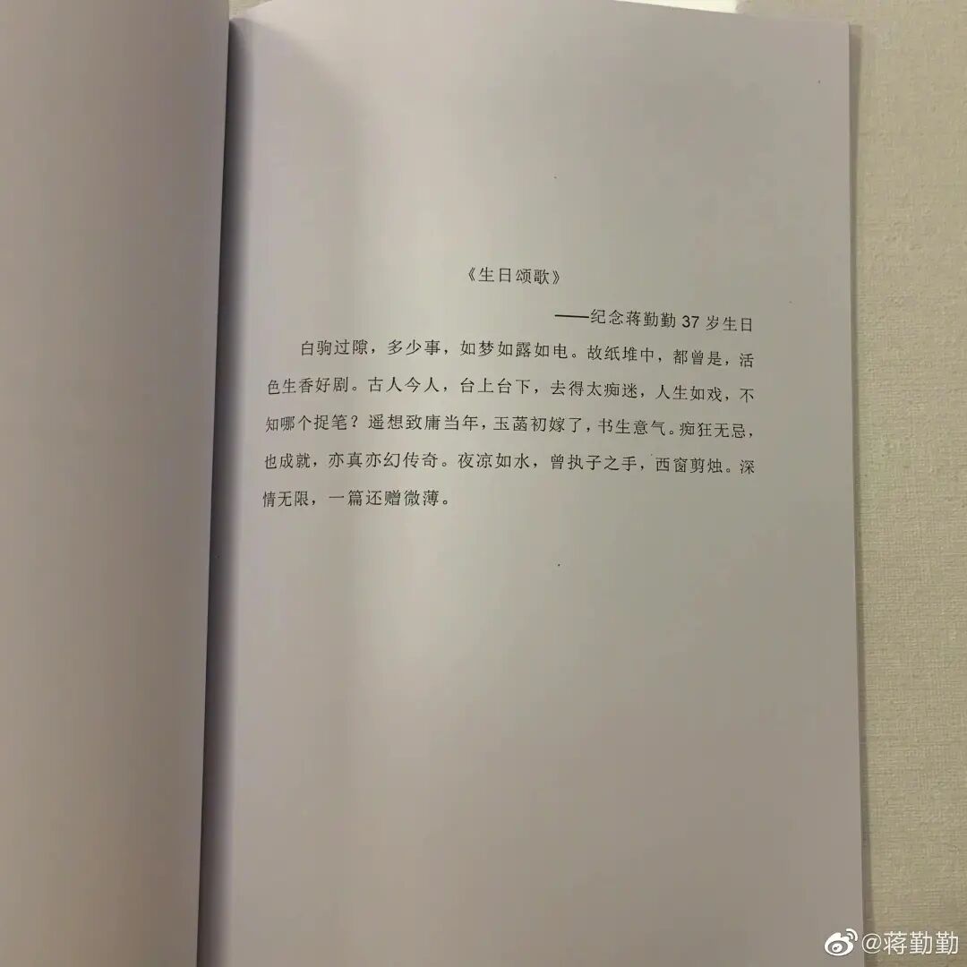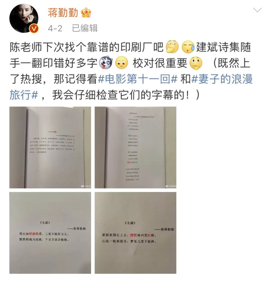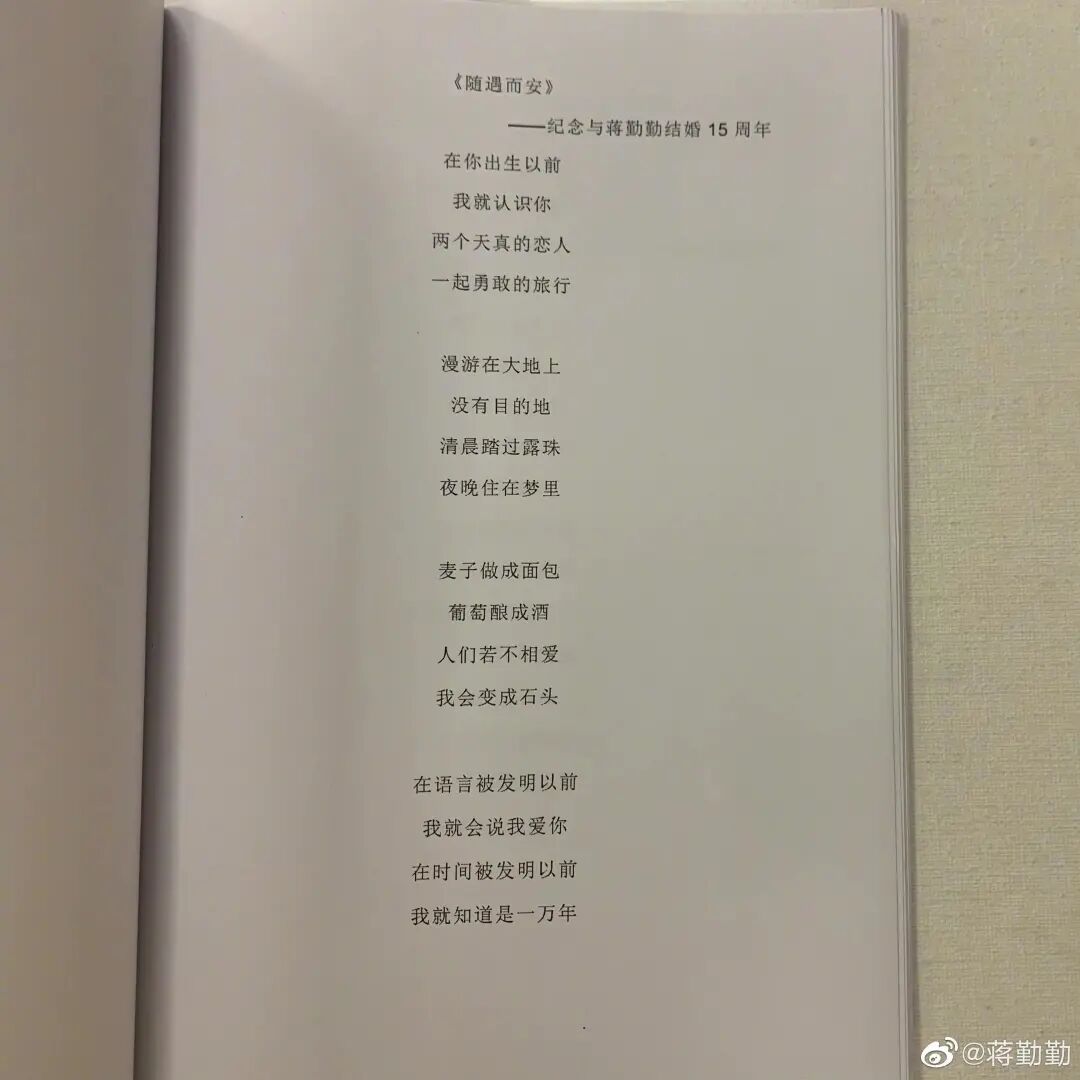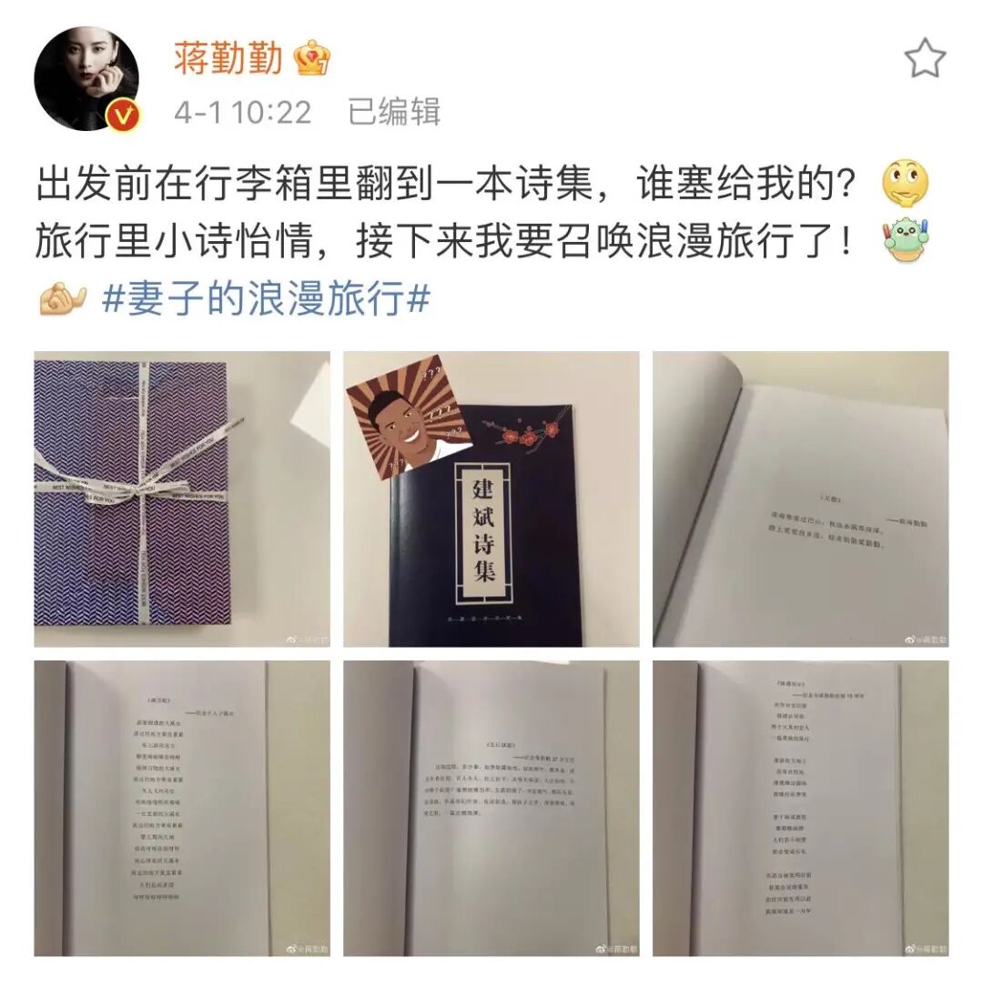蒋勤勤和陈建斌是《妻子的浪漫旅行》第五季的嘉宾,蒋勤勤出发前,陈建斌在她包里塞了一本自己写的诗集。