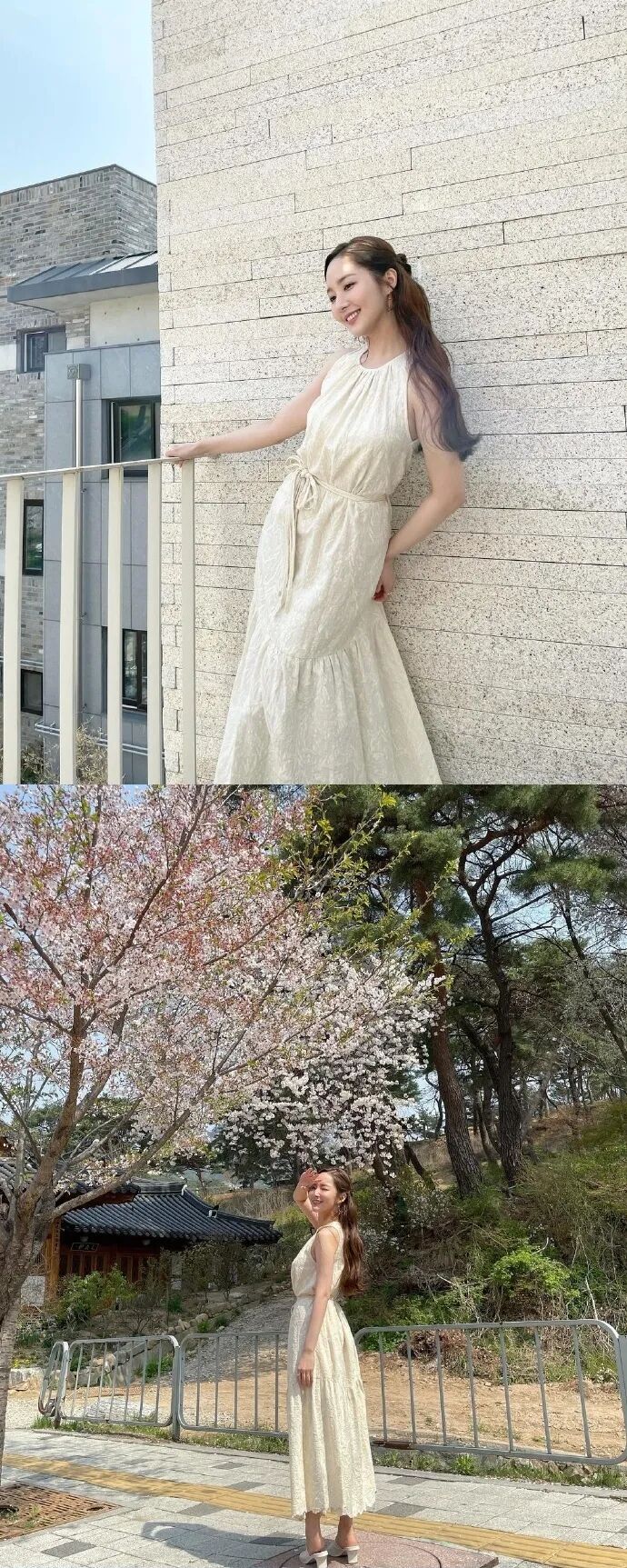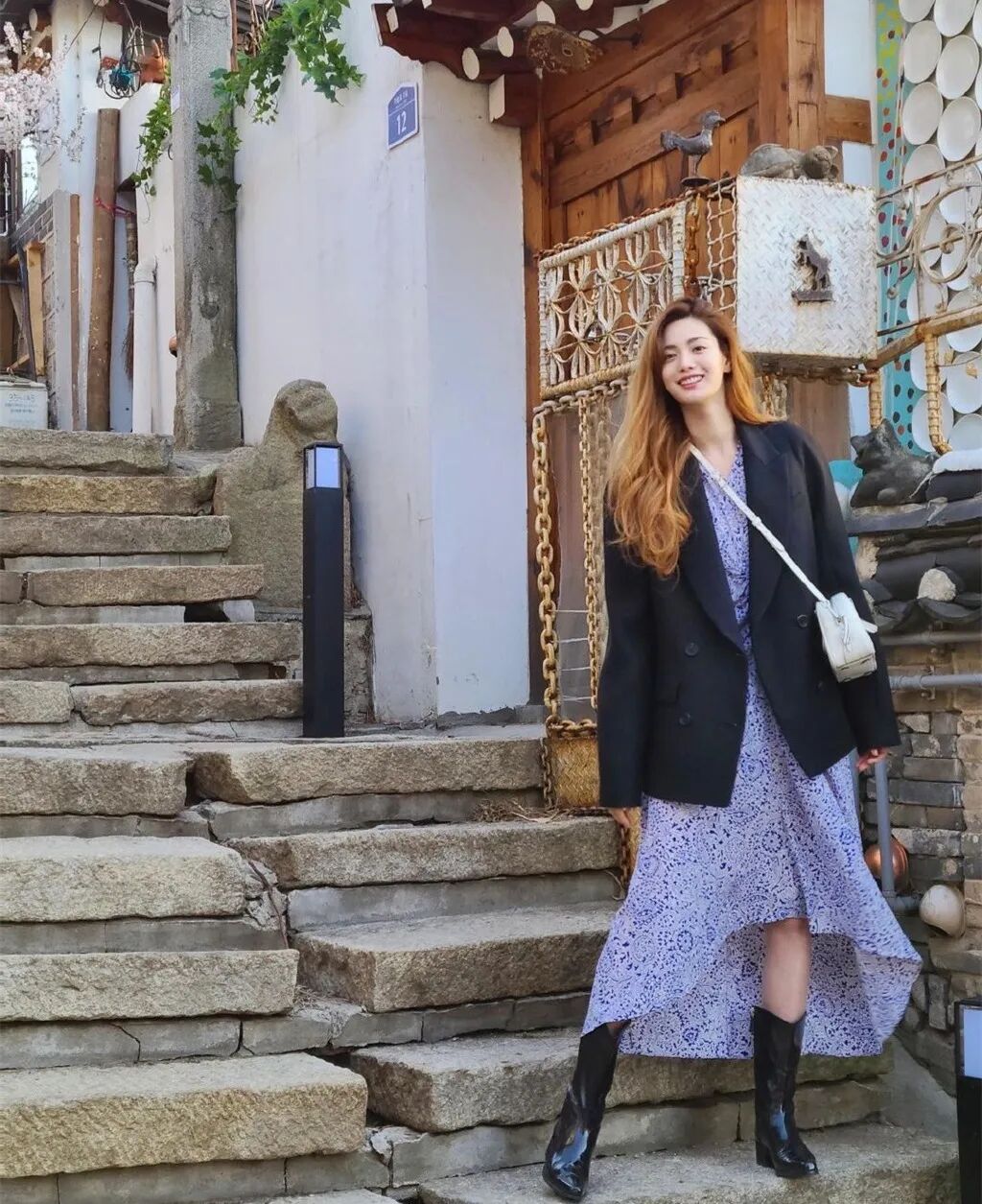 连衣裙加裁剪正好的西装,也是这个季节最适合的搭配,最近N位女星都这么穿啦,比如林珍娜: