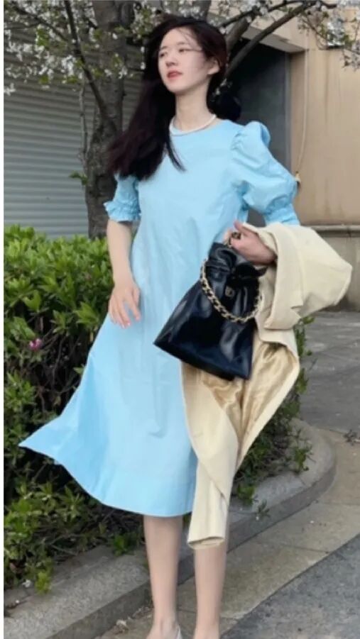 另外别觉得大胸适合穿V型领,穿这种也会好看,大胸往往也伴随着肩膀厚呀,这种裙子没有明显的肩线、也无腰线,谁穿谁就膀大腰圆。