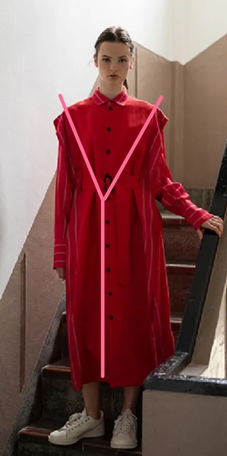 a.谁穿谁大妈的地雷款:“Y字落肩袖连衣裙”。
