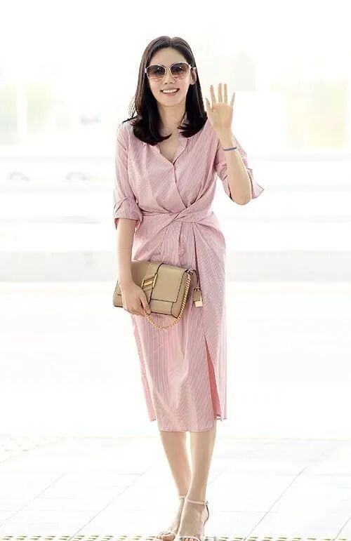 △图为秋瓷炫当时婚礼后首次现身机场,穿了条粉色条纹衬衫裙,温婉清丽,我记到今天~
