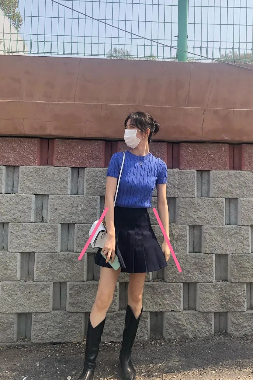 最近好多女星爱穿娃娃裙,上半身很瘦的梨型确实可以穿穿看,黑袜子比不穿袜子以及白袜子说不定更显脚踝细~