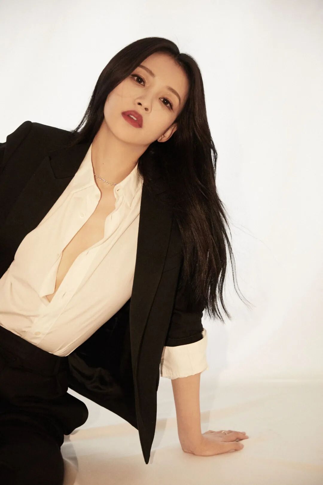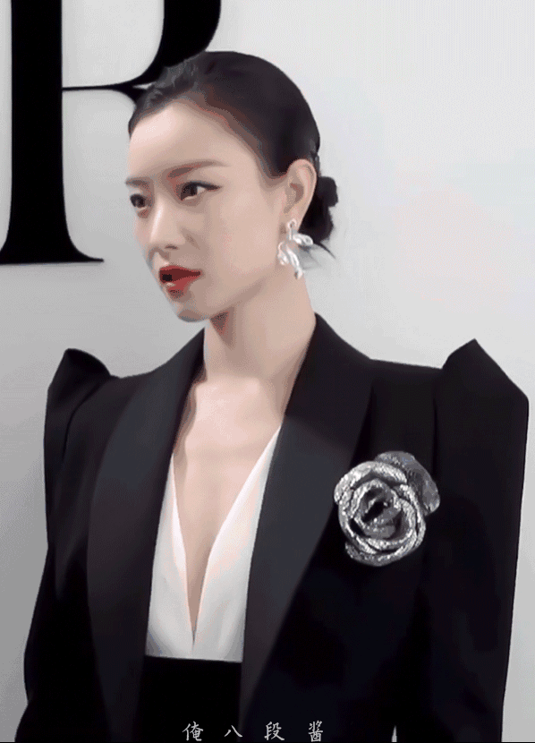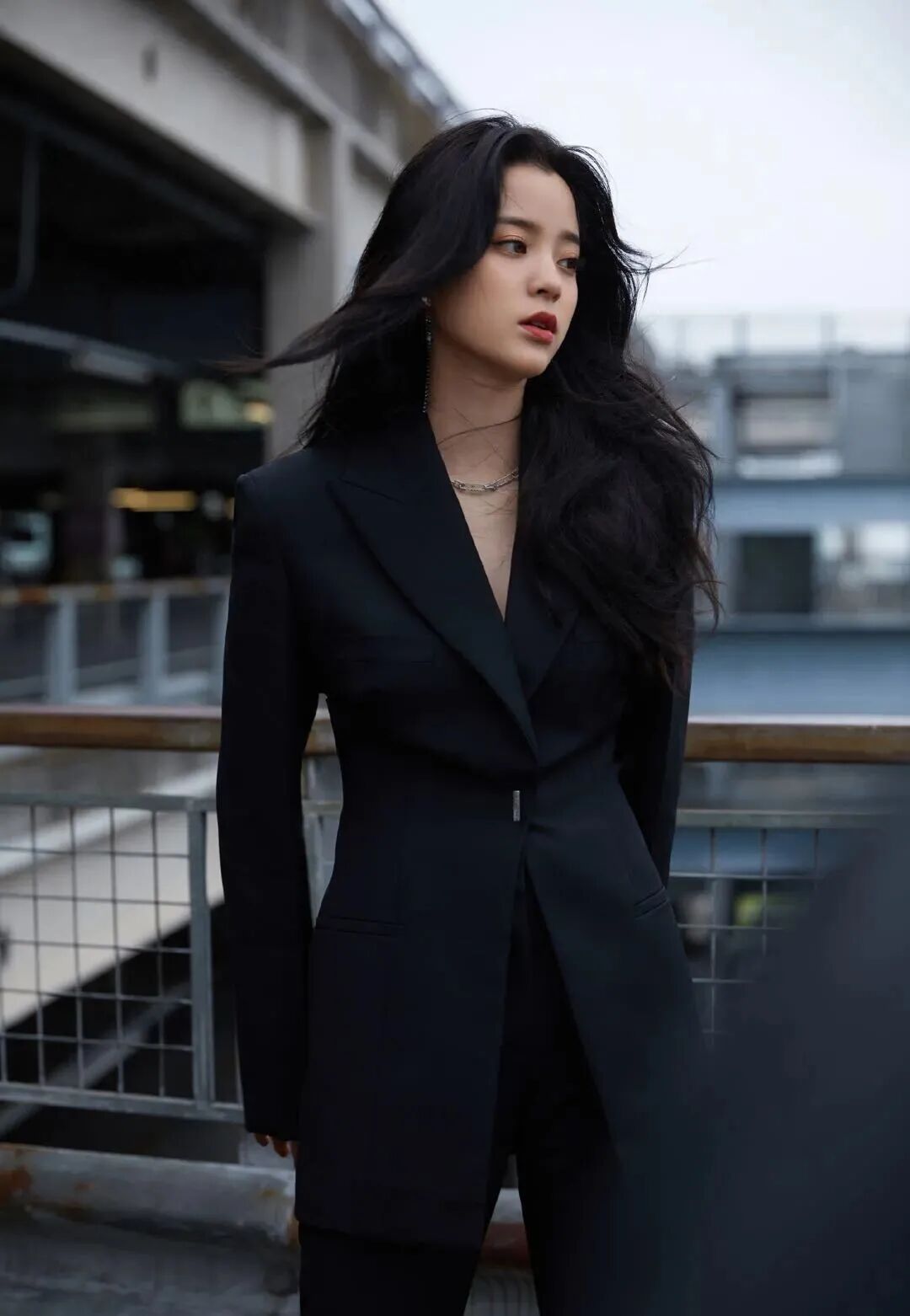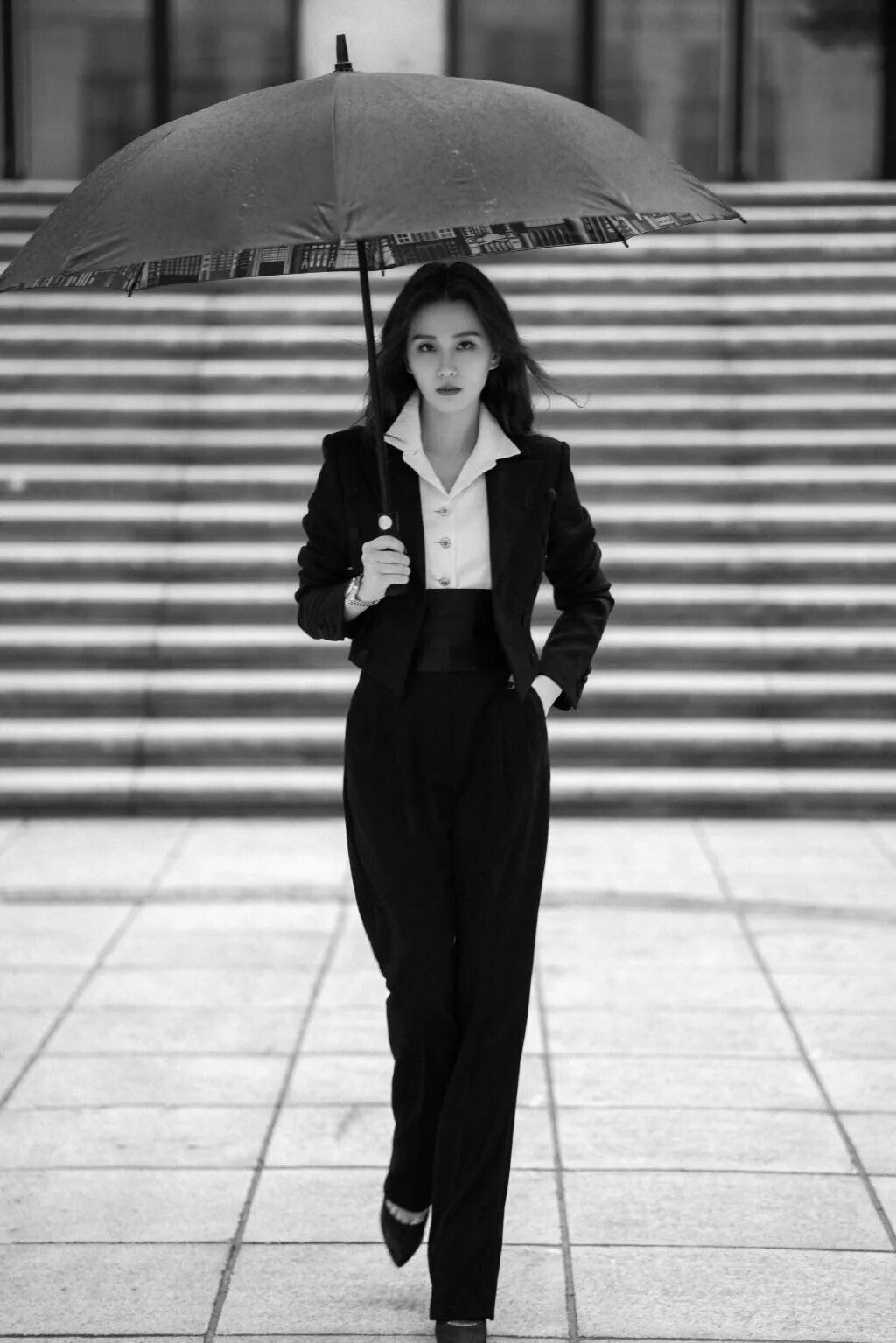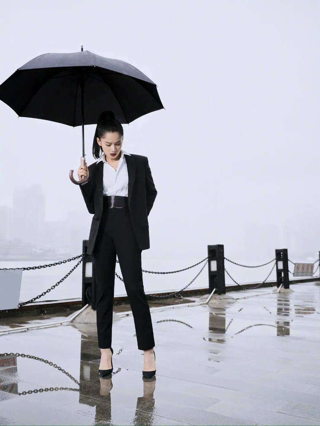 一身高马尾加黑色西装的造型,酷飒有余氛围十足,有上海滩女特工内味儿了~