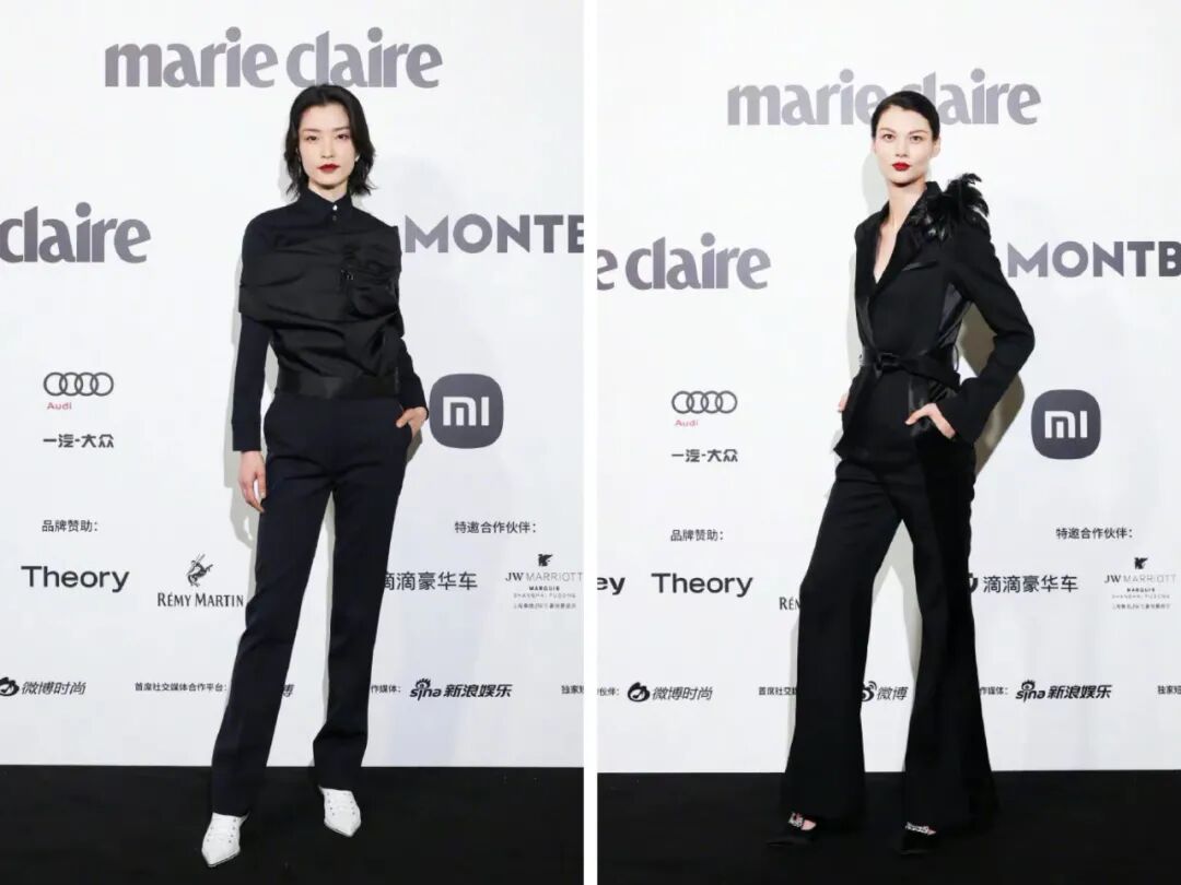 还有同穿all black的杜鹃和王雯琴,一个用白鞋撞色,另一个则在肩上点缀羽毛。