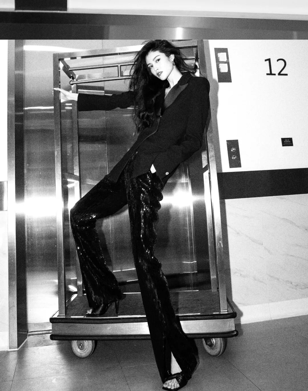 别致的裁剪、慵懒的卷发、闪亮的长裤、十足的气场,每一个细节都衬得她整个人闪闪发光。
