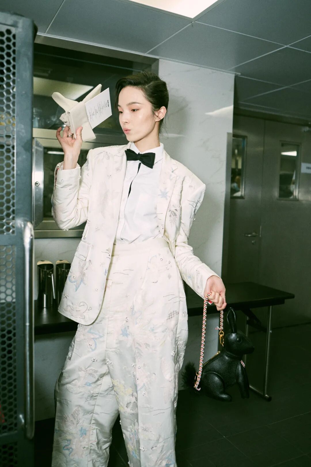 “小文具”雎晓雯穿的这套ThomBrowne白色印花套装也再适合她不过了,加上手里拎着的“小玉兔”,鬼马又精灵。