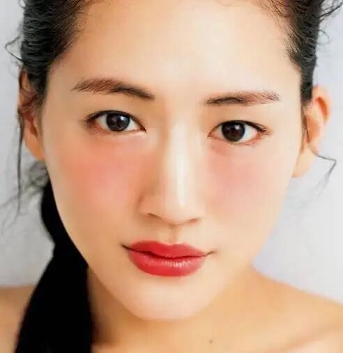 日系妆容喜欢突出血色感和无辜感,所以她们一般喜欢把腮红打在眼下和苹果肌两个部位。眼下腮红是宿醉妆的标配,前几年由新垣结衣带火,看起来迷糊又可爱,让人忍不住想啵一下。