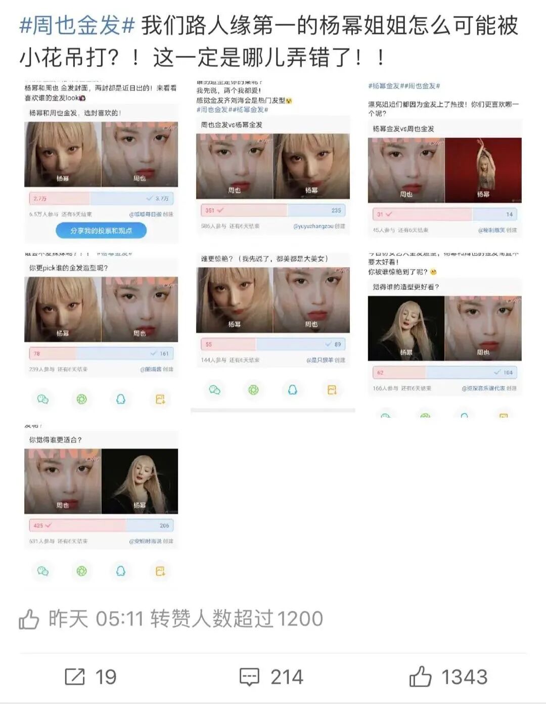 前两天,#杨幂金发#和#周也金发#这两个词条同时挂在高位热搜上。