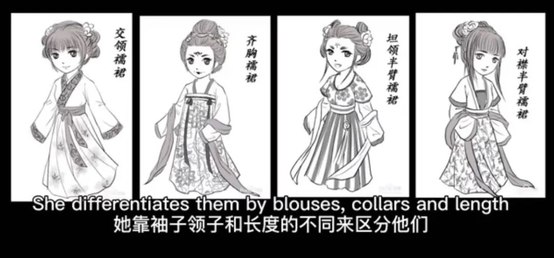 襦裙又分为交领襦裙、齐胸襦裙、坦领半臂襦裙和对襟半臂襦裙等。
