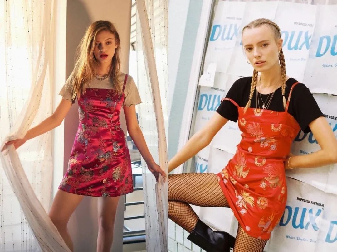 还有这种去掉领子的设计,直接变成吊带旗袍裙,Kaia用皮衣来当外搭,中西合璧,真的好cool!
