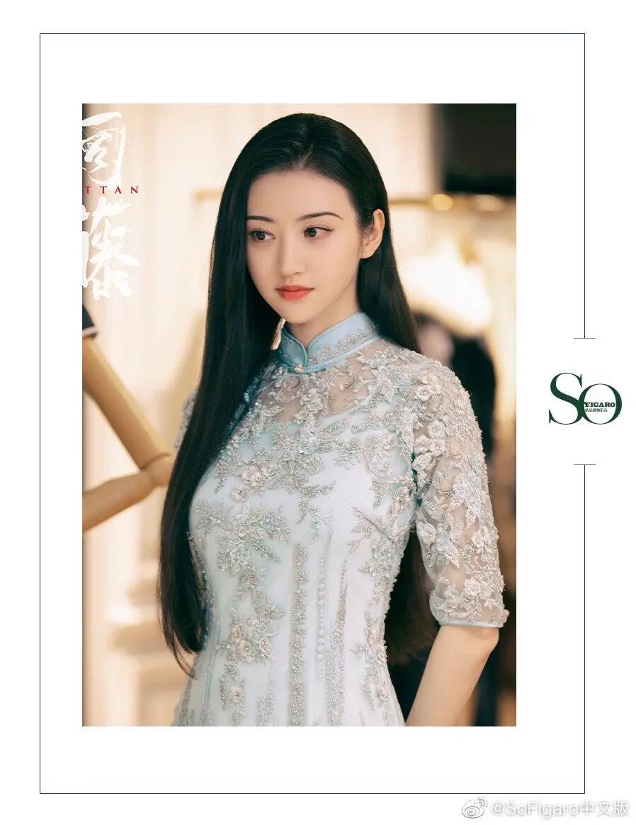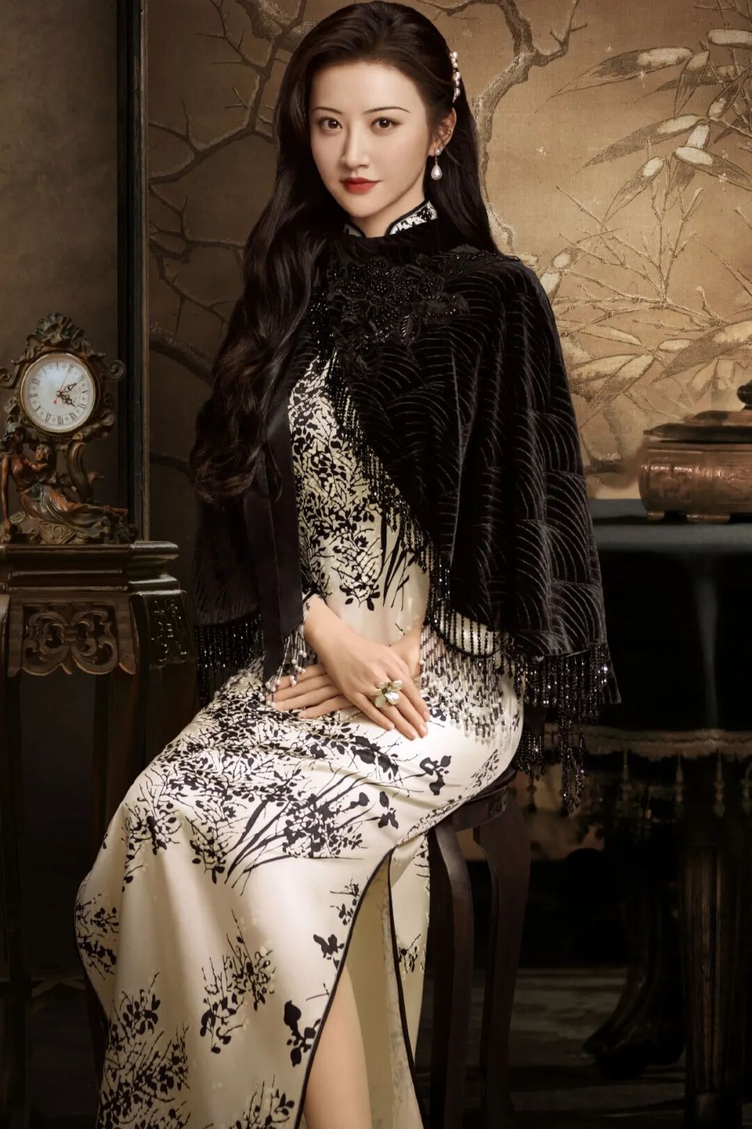 长款旗袍保留了旗袍中的古典韵味,也最能凸显身材曲线。因此,身穿长款旗袍的场合通常较为正式,对发型和妆容的要求也高一些。要么像司藤一样,留着垂坠乌黑的长发。