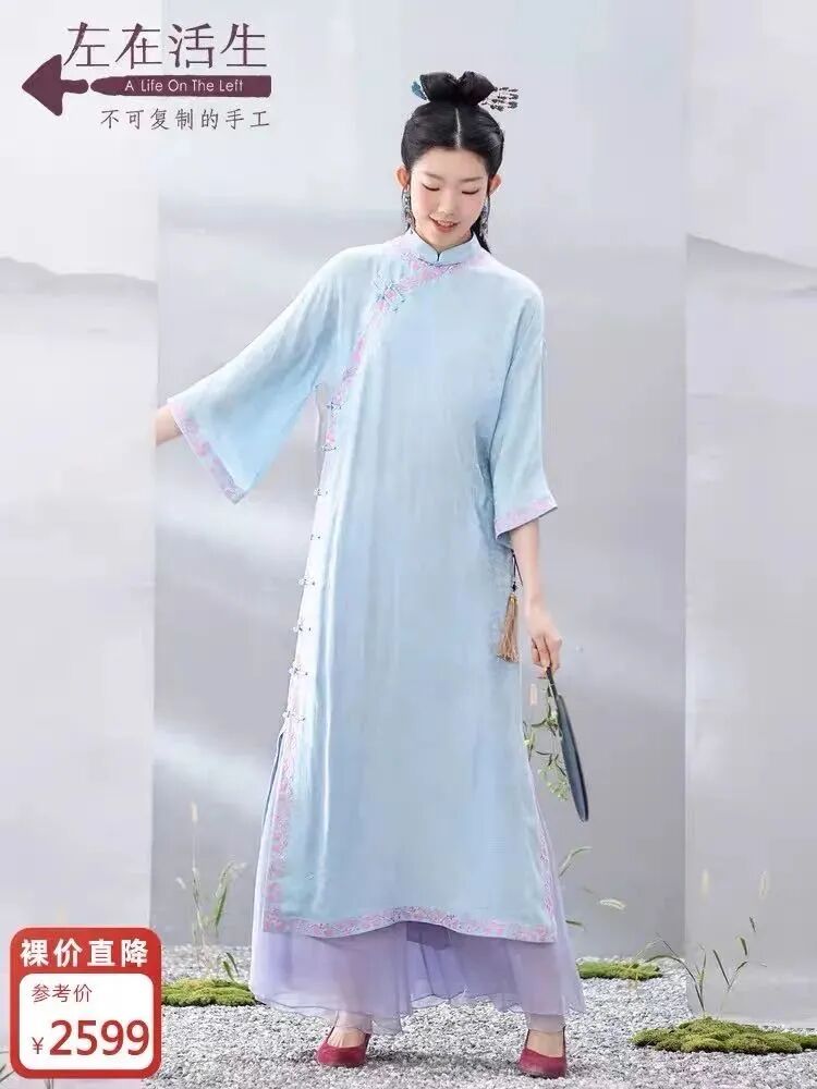 这家店的旗袍以长款为主,风格比较古典,还有点跟汉服结合起来的意思。