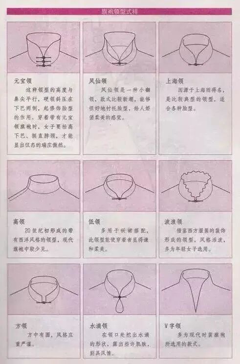 旗袍的领型大概分为九种:元宝、凤仙领、上海领、高领和低领等。