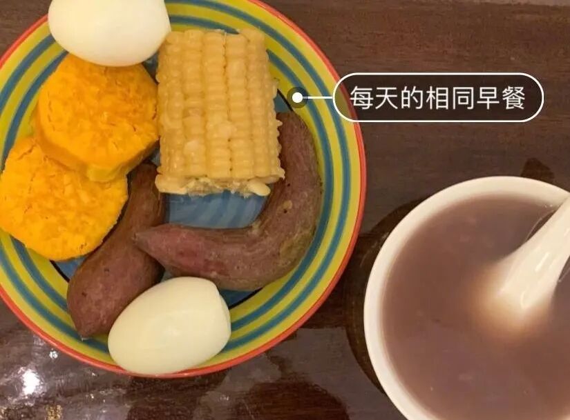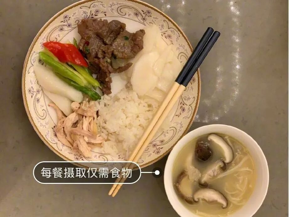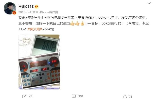 拍戏时,日常直接公式化:节食+早期+开工+羽毛球.健身+苹果(午餐.晚餐)=66kg。