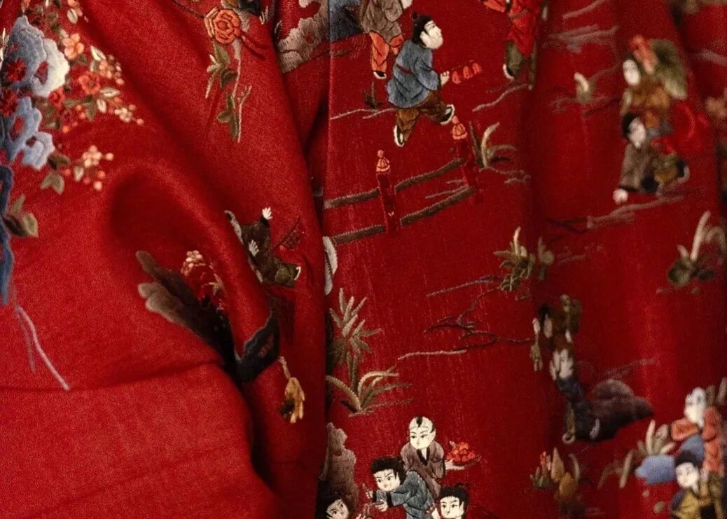细节也丝毫不拉垮,精致到一针一线。百子衣上的“开眼”还特意请了专家来绣,面料则用了有着“一寸缂丝一寸金”的美誉的织中圣品缂丝。