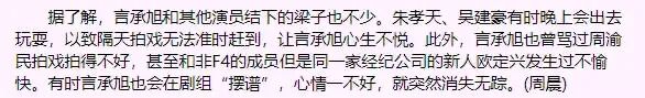 F4中另外三个成员在拍摄中也有一些嫌隙,说言承旭有点冷漠和耍大牌。