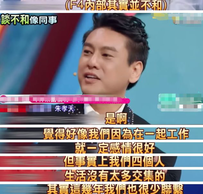 在19年的综艺里,朱孝天上了综艺《王牌对王牌》,被问到F4内部不和是否属实的时候,朱孝天还能说说:这些年很少联系,更像是关系很一般的同事。