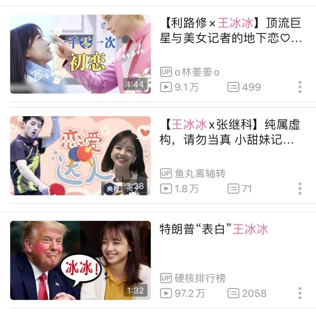 王冰冰 x 利路修、王冰冰 x 张继科,甚至还有王冰冰 x 川普(这个都快破100w观看了)???