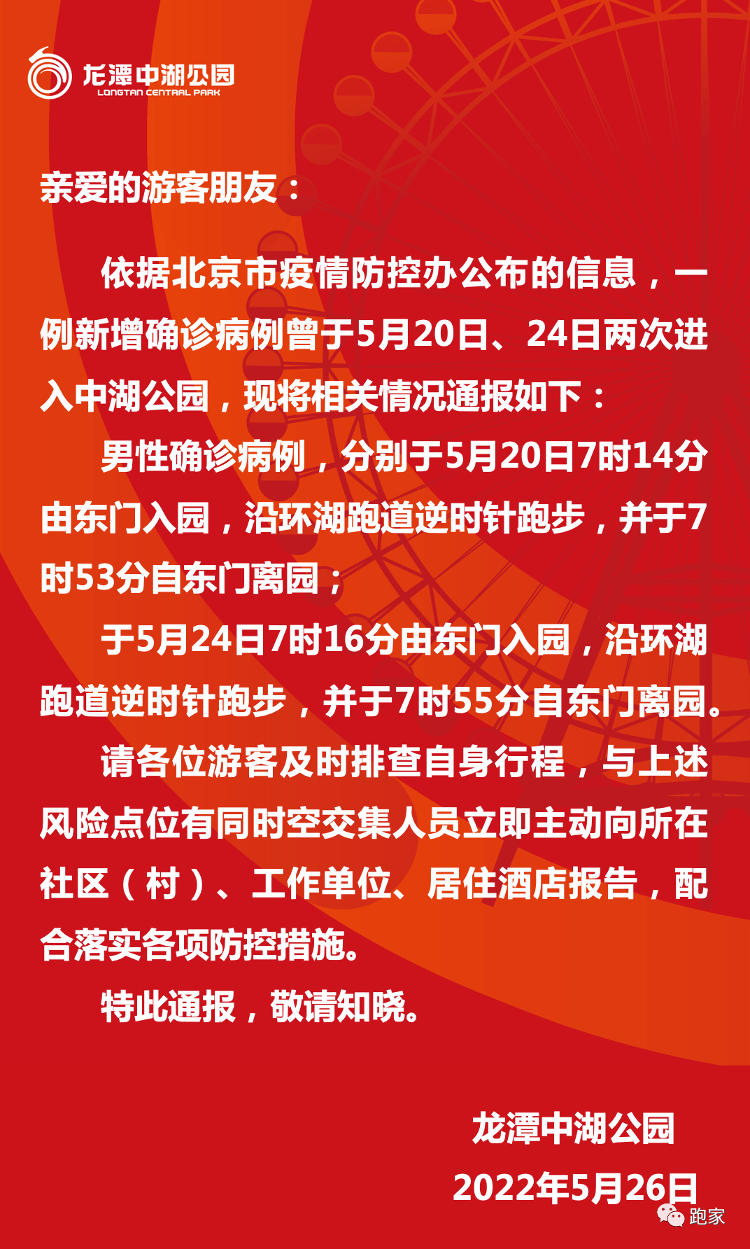 龙潭中湖公园园方发布公告提示有与病例时空交集的游客注意自查报备。