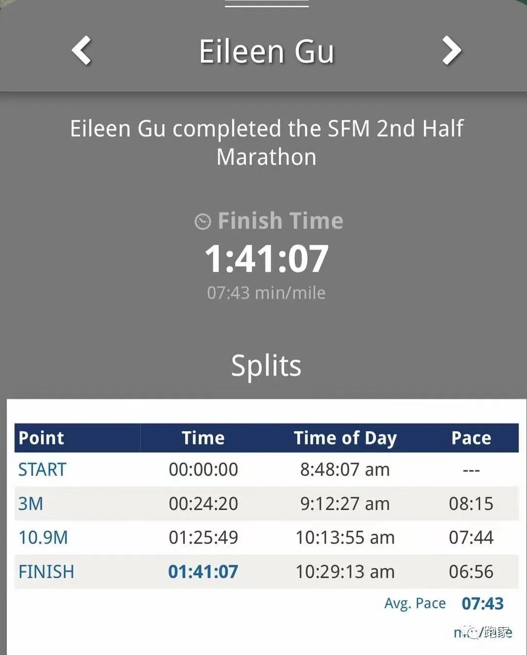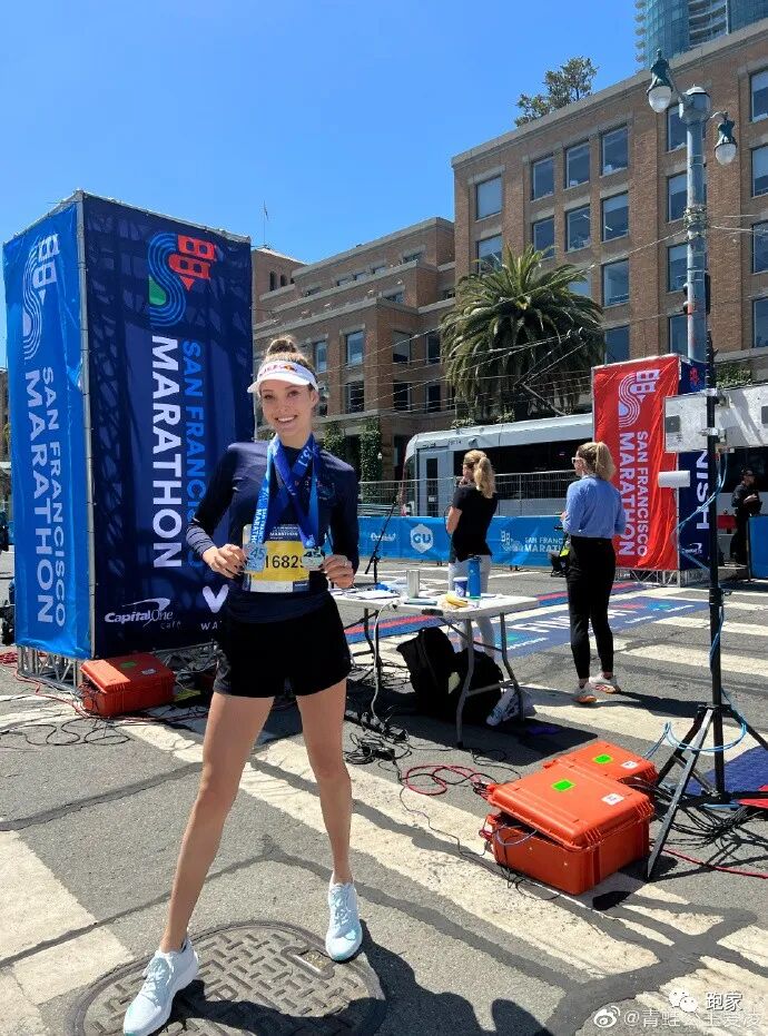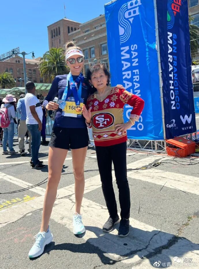 她自己说,36小时前刚抵达旧金山,正好碰上旧金山马拉松。目标设为努力完成半马,没想到在第七mile(11公里)时还感觉不错,开始加速。最终感觉很好!