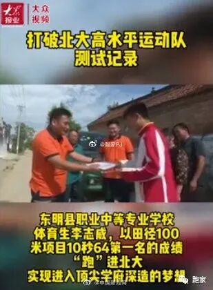 7月18日,山东省东明职业中专学生李志威收到了北京大学发来的录取通知书。据悉,2022年2月26日,李志威参加了北京大学高水平运动员测试,他以田径100米项目10秒64的成绩,打破了北京大学高水平测试纪录,实现了进入顶尖学府深造的梦想。(大众日报)