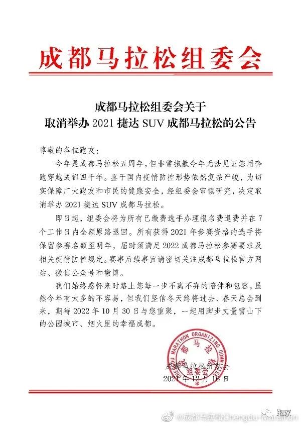 12月16日,成都马拉松组委会发布公告,决定取消2021年的赛事。选手退费事宜正在进行,7天内到账。所有选手资格保留至明年,根据公告,明年赛事定在10月30日。