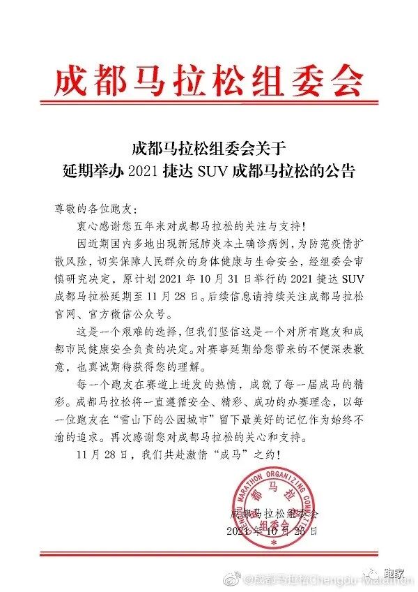 官宣:2021成都马拉松取消