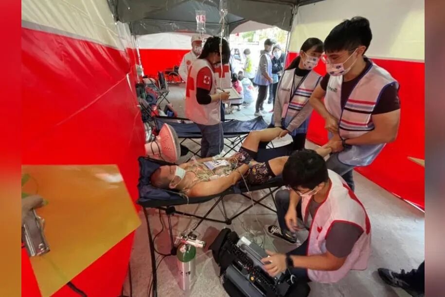 满头问号的张开了眼睛才发现我不是在路边而是在救护站的帐棚内,两名医护正在帮我按摩双脚、右手打著点滴、左手有心率计而身上贴著心电图贴片与放置著冰块降温,旁边站著一位跑班的同学阿丽正在帮我煽风降温,另外老邓教练也在旁边关心我的状况,当下其实很紧张,因为不知道自己发生了什么事,又这么多医护在处理自己的身体,一度认为自己可能要挂了而产生换气过度的状况,在身旁的人提醒下才把专注力放在呼吸上,自己也才渐渐稳定了下来。