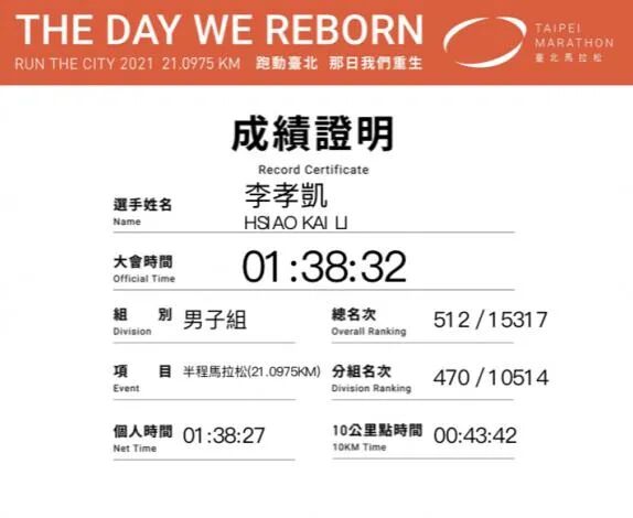 说实在我真的不知道怎么跑完的,朋友说或许是跑鞋上有神人签名帮助我跑完的吧。2021台北马拉松虽然带点遗憾(没完赛感),但又觉得这经验很特别,这次很幸运只是中暑且没有大碍,希望之后自己能更注意一下身体的反应,能平安完赛才能享受路跑的乐趣。最后要特别感谢当天的医护人员、阿丽、老邓教练与所有关心我的朋友,谢谢你们当下的帮忙让我的状况可以快速恢复,也恭喜阿丽大破PB,下场比赛我也要跟在妳后面比YES啦。