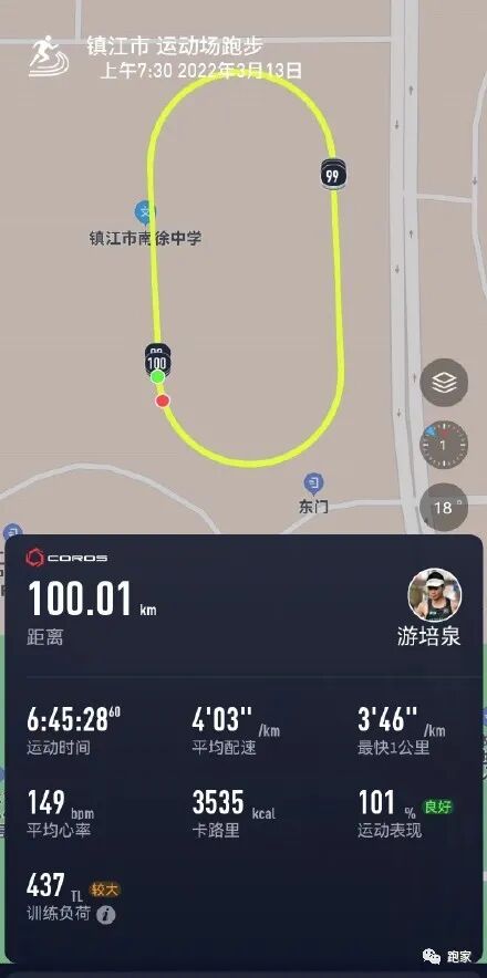 3月13日,国内百公里场地赛(100公里超马)最快速度于镇江体育会展中心诞生。超马、越野跑者游培泉最终用时6小时45分23秒,创造该项目新的国家纪录。