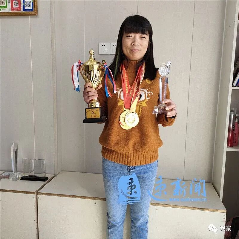 张小利身材苗条健美。墙边的一排奖牌奖杯展示着她的跑步成绩。