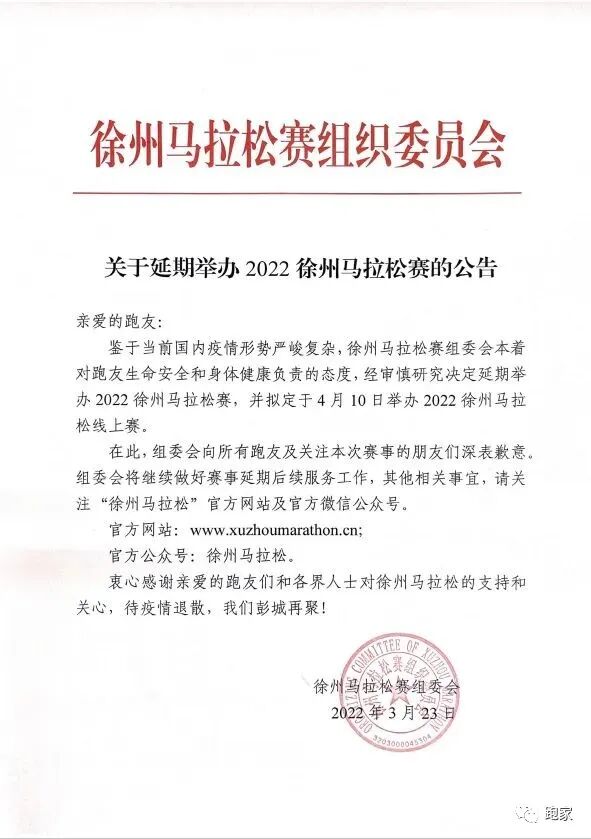 继厦马马拉松、重庆马拉松延期后,又一场原计划于4月10日举办的大型马拉松赛事——徐州马拉松宣布延期。4月份的国内马拉松,看上去要没了……