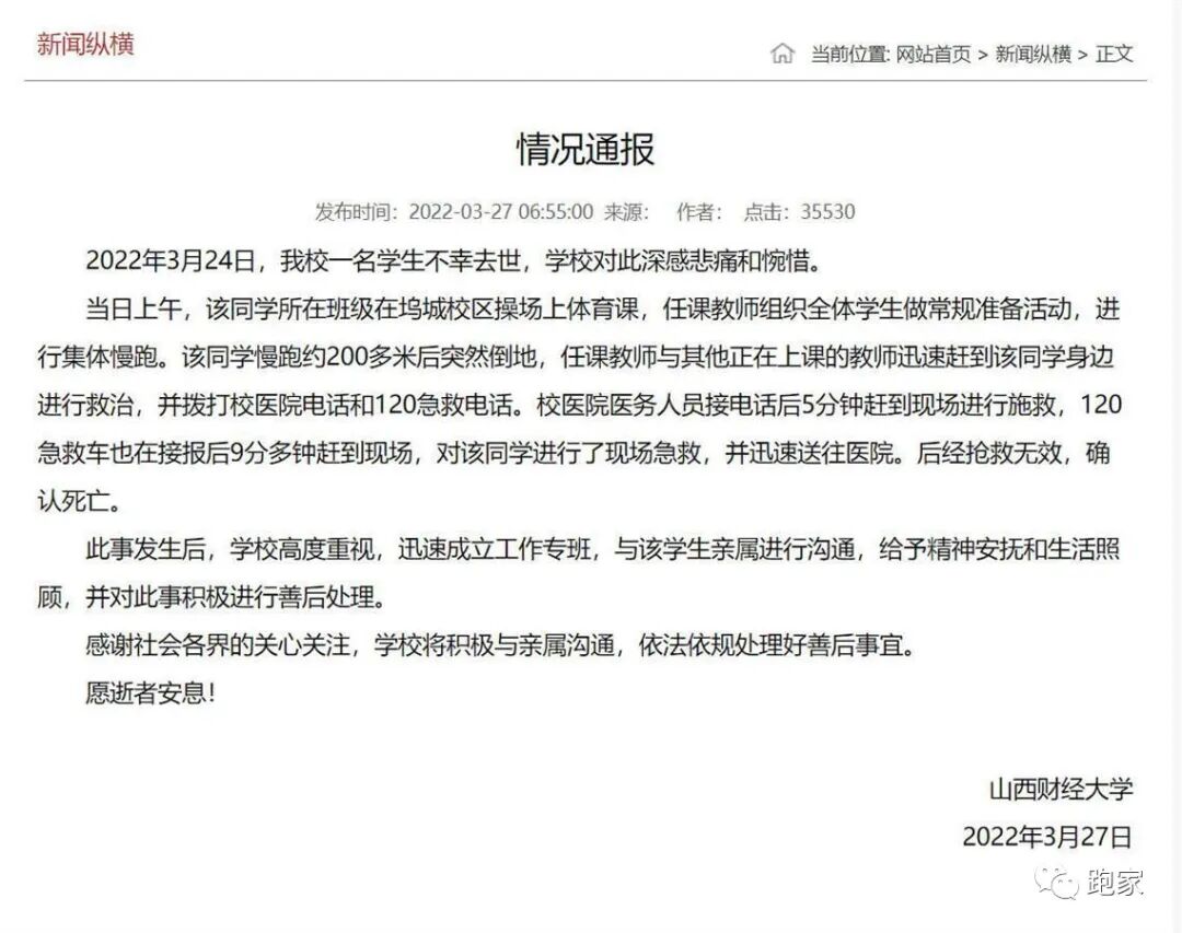 近日,山西财经大学一女生跑步时不幸倒地身亡,有网传消息质疑称抢救不及时。3月27日,校方发布情况通报并回应:24日该同学慢跑约200多米后突然倒地,老师迅速赶到救治并拨打校医电话和120电话。校医5分钟赶到现场施救,120也在接报后9分多钟赶到现场,后经抢救无效,确认死亡。