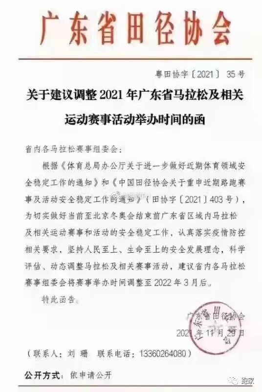 昨天广东省田径协会发布了一则通知,建议省内2021年的所有马拉松和路跑赛事延期到2022年3月之后再办。虽然用的是“建议”,但是效力如何大家都懂。