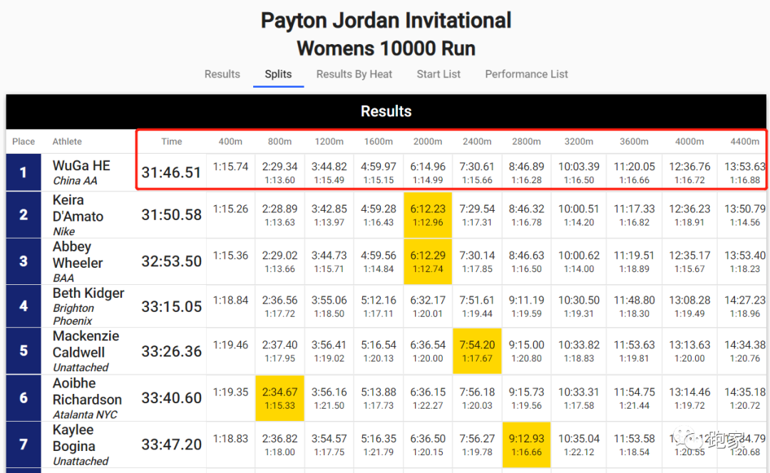 从赛事方的数据统计可以看出,何巫呷在完成9200米后开始提速!9200米到9600米即倒数第二圈,她的单圈用时1分13秒44,最后获得第二名的达玛托本圈成绩1分16秒49!总成绩上,9600米后,何已经比达玛托快了0.52秒。