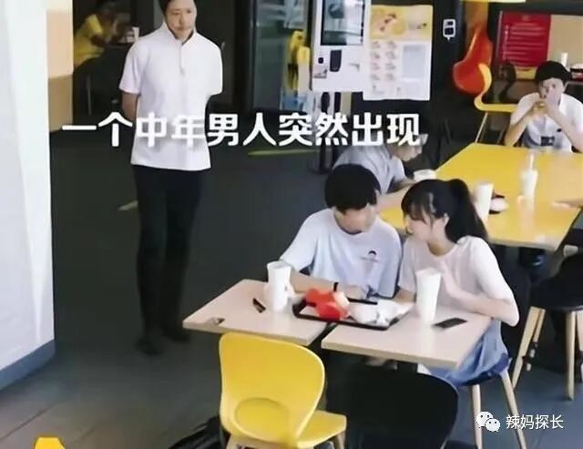 视频中,两个看起来像是高中的男生女生,坐在餐厅一起开心地聊天,这个画面本来没什么特别的,但是他们的斜后方却站着一位表情严肃的中年男子。