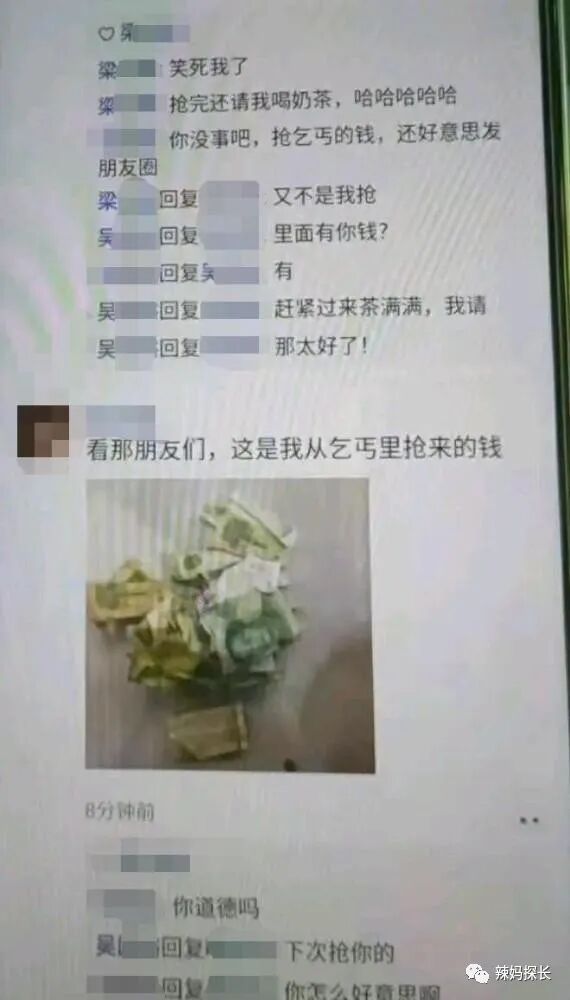 这两名高中生从一位乞讨的老爷爷手里,抢走了他积攒的仅有的几元钱,并发朋友圈炫耀,还声称要请同学喝奶茶,似乎认为自己很有本事。