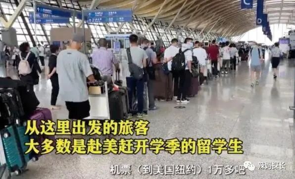 机场进站口排的长队中,大部分都是赴美的留学生,由于开学季要赶到学校报到,所以不少学生为了完成学业,顺利拿到毕业证,实现自己海归的身份,不惜花大价钱买机票、排一天的队,也要坐上飞机出国。