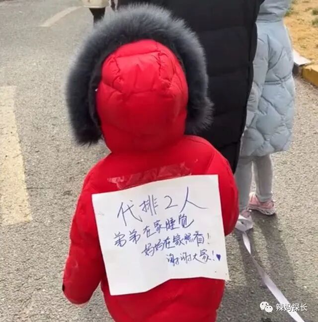 视频当中我们能够看到一个看起来只有4、5岁的女孩子,本应该在父母的怀抱中被呵护着的,却要早早的独自一人,在陌生的人群中替家人出来排队。