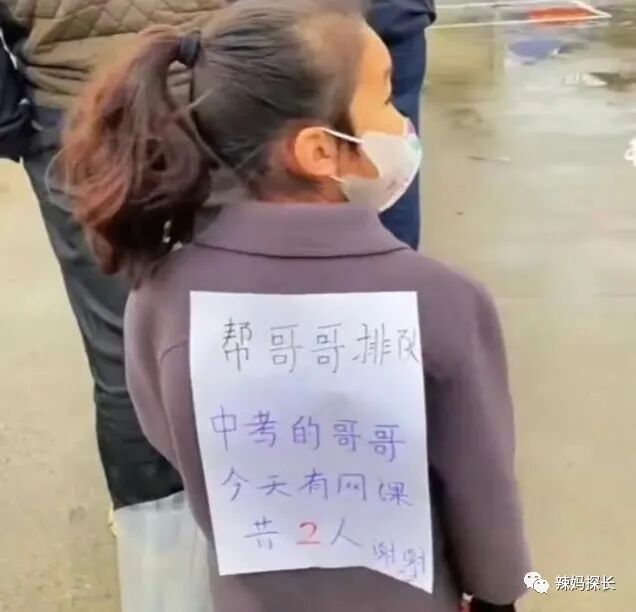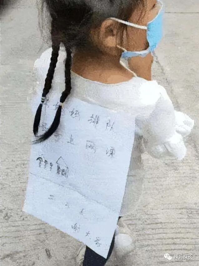 在一个排队做核酸的队伍当中,有一个孤独的小女孩儿引来了大家的关注,因为这个女孩儿的背后贴了一张纸条。
