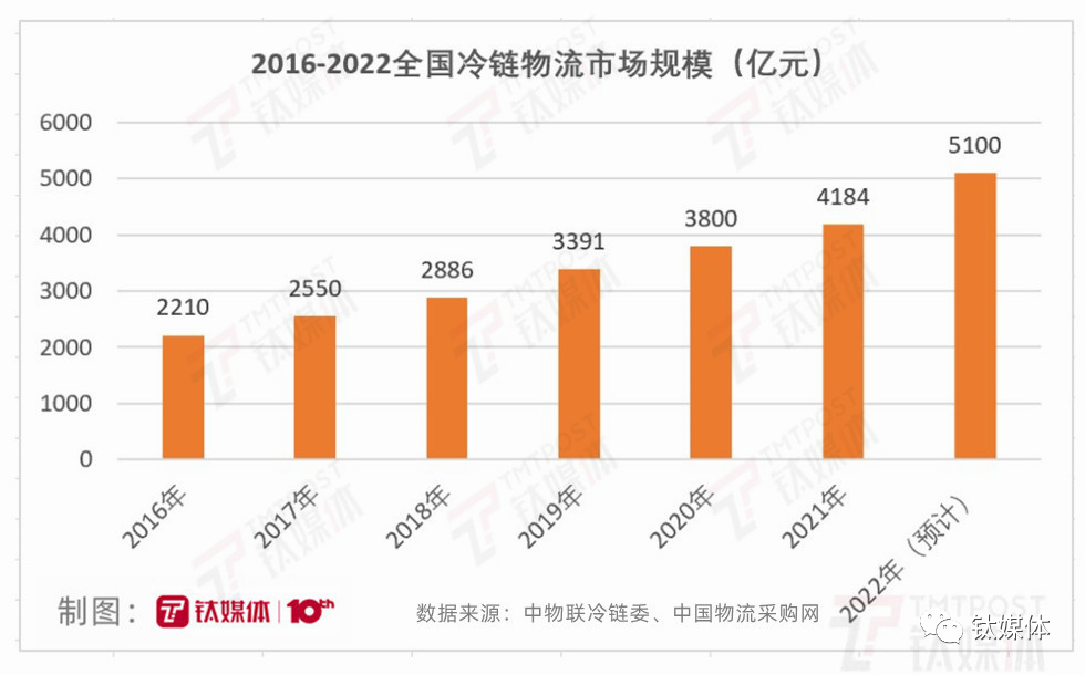 冷链物流在中国经济中到底已占据什么地位?钛媒体App根据官方信息统计的这组数据或许可以说明这个问题。2019年,中国冷链物流行业市场规模近3400亿元,比2018年增长505亿元,同比增长17.5%。2020年市场规模超过3800亿元;2021年规模已经达到4184亿元。到2022年,国内冷链物流行业市场规模预计将超越5100亿元。按照交通部的预计,2025年,冷链物流市场规模就会跨过5500亿元。