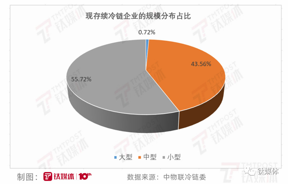 一方面,相较于美国、日本等国家,国内冷链物流产业起步晚,冷链大型企业较少,多为中小型企业。据相关数据显示,中国现存续的冷链企业中,中小型企业数量占比高达99.28%。