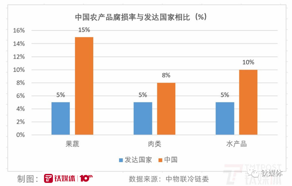 目前,中国冷链物流大部分是生鲜食品类。但由于农产品流通环节多,规模化、组织化程度偏低,物流成本较高。中国生鲜农产品物流成本占总成本的30%至40%,损耗率高达10%至15%。而在欧美,这一数据只有不到5%。