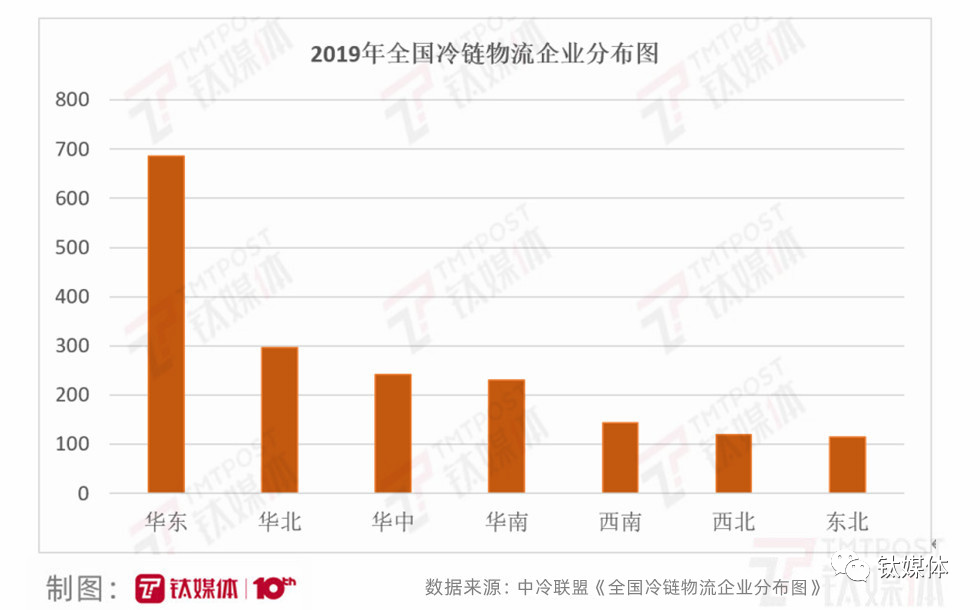 2019年,中国华东地区的冷库容量、冷库企业数量最多,占比全国冷库总量的41%,华北地区占比15%。而西北和东北地区作为农产品的主产地其冷库容量总和仅占全国的13%。