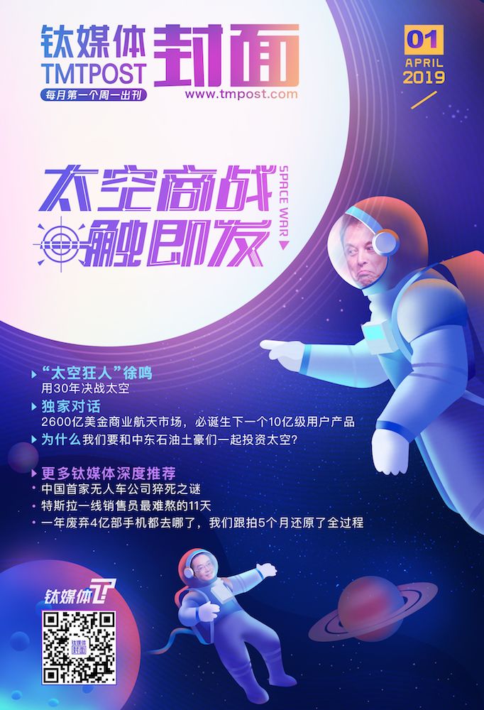 另一方面,在商业太空市场上,民营火箭和商用卫星发展也正是如火如荼。就此,2019年「钛媒体·封面」第一期4月刊,我们将视角投向“商业航天”市场。2600多亿美金规模的卫星产业,到底有哪些潜在商业空间?为什么说下一个连接10亿人的产品会诞生在这个产业?