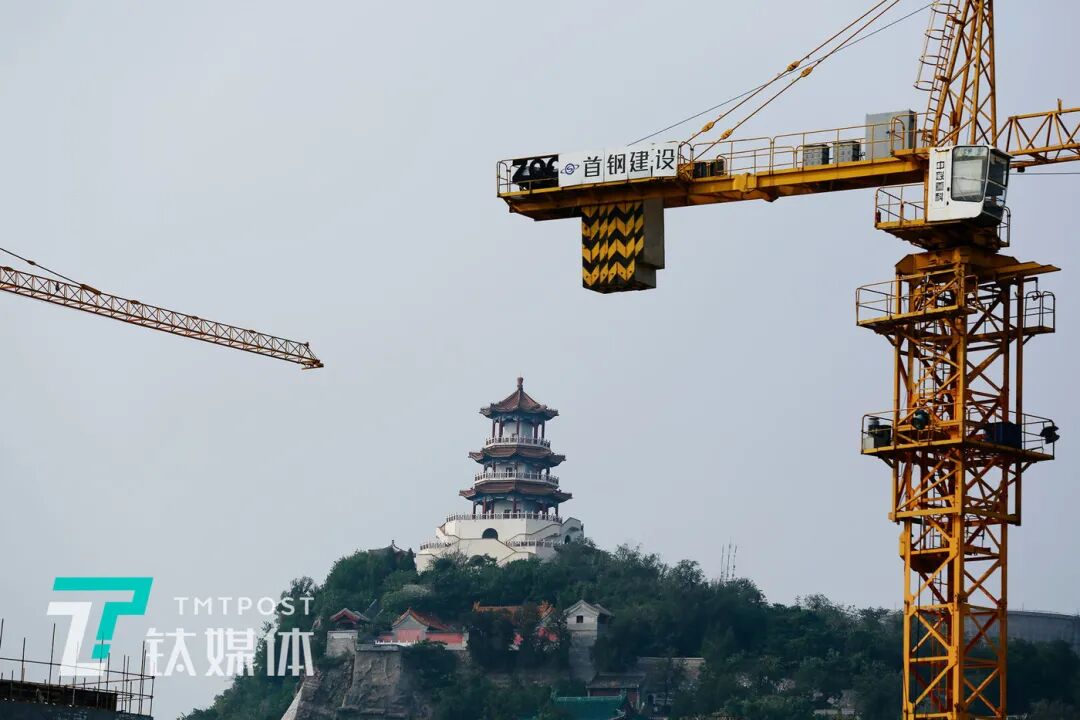 首钢园内正在施工的工程以及远处的石景山 ( 图/钛媒体 孙林徽)