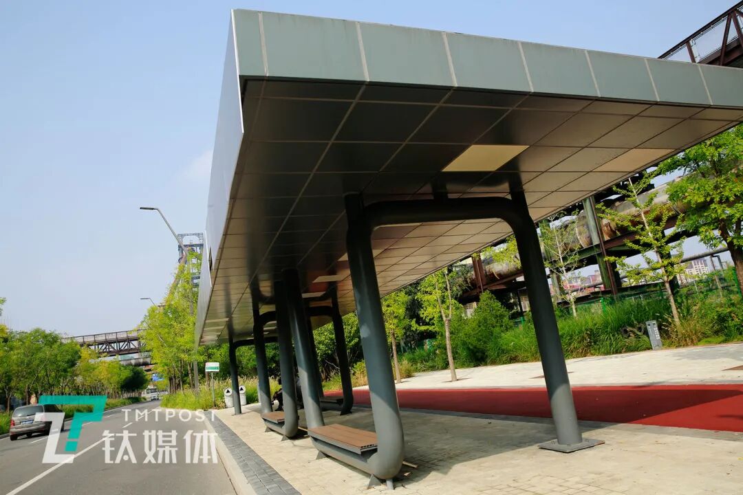 首钢园内,契合整体园区风格的公交车站 ( 图/钛媒体 孙林徽)