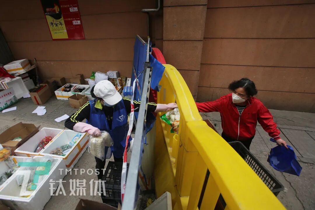 围挡将居民的长队和黄波的货物分隔在小区内外。居民踩着椅子,从围挡另一边露出小半截身子,向黄波报出自己的订单号和手机尾号,黄波对照订单表找到对应商品,一件件拣选装袋,再将袋子举过头顶,从围挡上递过去。