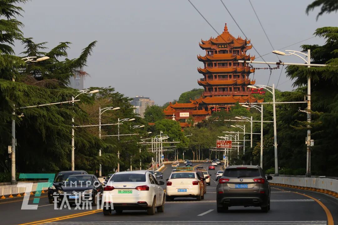 4月8日下午5:30,武汉市,黄鹤楼前的车流。当天,武汉宣布解封,离汉通道全部打开。